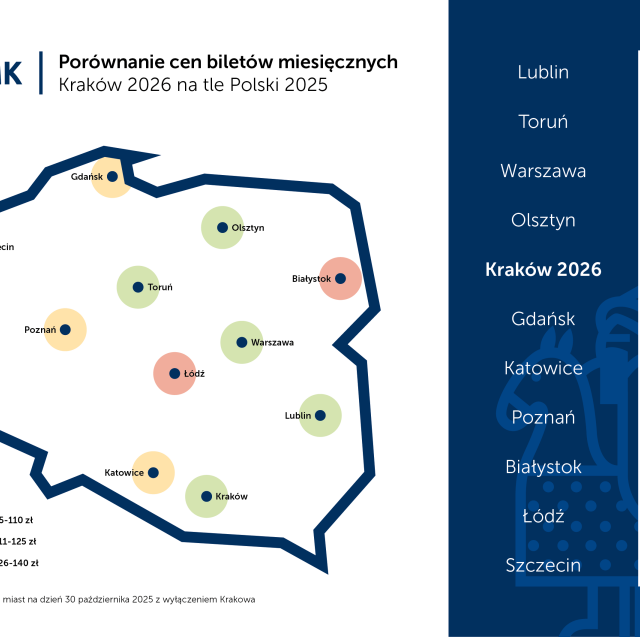 Po tych zmianach bilety miesięczne w Krakowie będą nadal należały do jednych z najtańszych w skali całego kraju. Na podobnym poziomie ceny biletów miesięcznych sieciowych (109 zł) kształtują się obecnie w innych dużych miastach: Lublinie, Toruniu czy Warszawie, a w 2026 r. mogą być jeszcze wyższe.