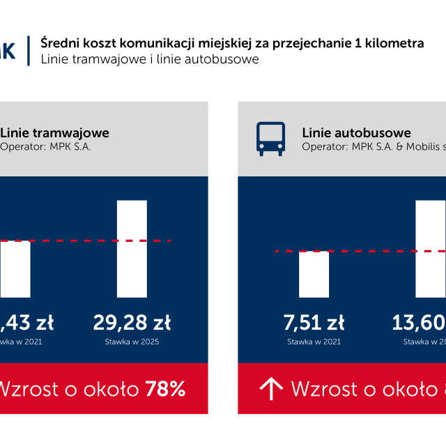 W ostatnich latach znacząco wzrosły koszty realizacji pracy przewozowej, co bezpośrednio wpływa na konieczność aktualizacji taryfy biletowej. W przypadku linii tramwajowych stawka za jeden kilometr wzrosła w latach 2021–2025 z 16,43 zł do 29,28 zł, czyli o około 78 proc. Podobny trend widoczny jest w transporcie autobusowym – średni koszt jednego kilometra (uwzględniając wszystkie rodzaje pojazdów) wzrósł w tym samym czasie z 7,51 zł do 13,60 zł, co oznacza wzrost o ok. 81 proc.