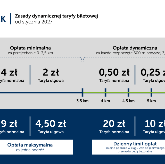 Propozycja przewiduje też, że w styczniu 2027 r. zostanie wprowadzona kolejna zmiana w taryfie biletowej, nowością miałaby być taryfa dynamiczna. Pozwoliłaby ona na naliczanie opłaty w zależności od faktycznego dystansu pokonanego przez pasażerów. Rozwiązanie to umożliwiłoby bardziej elastyczne korzystanie z transportu miejskiego, było już pilotażowo testowane.