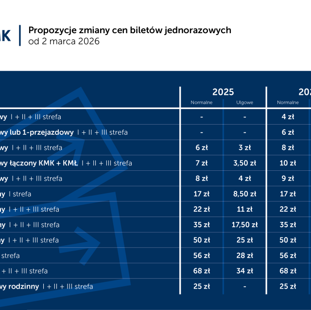 Proponowana zmiana cen biletów jednorazowych i czasowych od 2 marca 2026 r.