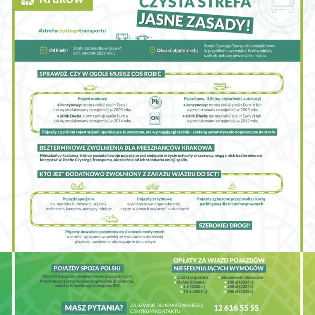 1 stycznia 2026 r. wprowadzone zostanie odpowiednie oznakowanie, a wszystkie zasady i uprawnienia wjazdu zaczną funkcjonować zgodnie z uchwałą Rady Miasta Krakowa. Strefa Czystego Transportu obejmie ok. 60 proc. obszaru Krakowa, w obrębie IV obwodnicy Krakowa.