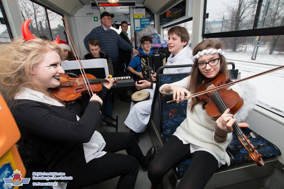 W tramwaju kolędy i pastorałki wspólnie z pasażerami śpiewali uczniowie Państwowej Ogólnokształcącej Szkoły Muzycznej II st. im. F. Chopina w Krakowie.