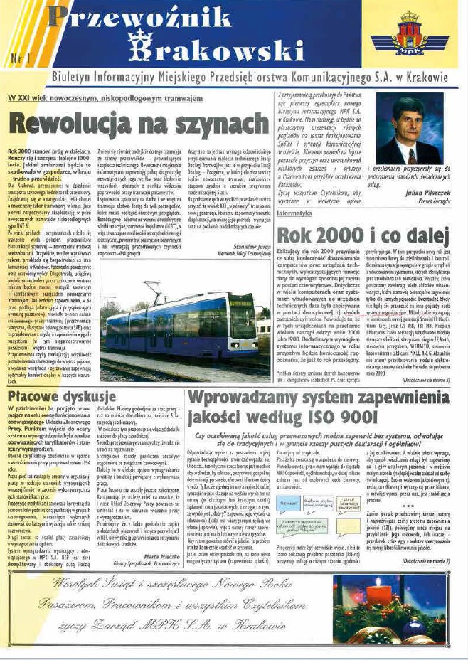 Pierwszy numer Przewoźnika Krakowskiego ukazał się przed Świętami Bożego Narodzenia w 1999 roku. Z założenia miało to być czasopismo ukazujące się dosyć regularnie w odstępach kwartalnych, redagowane nie przez zawodowych dziennikarzy, lecz przez pracowników Miejskiego Przedsiębiorstwa Komunikacyjnego w Krakowie, a przeznaczone dla pracowników, ale oczywiście nie tylko. Wielu jest przecież ludzi interesujących się firmą, jej działalnością i problemami występującymi w komunikacji publicznej.